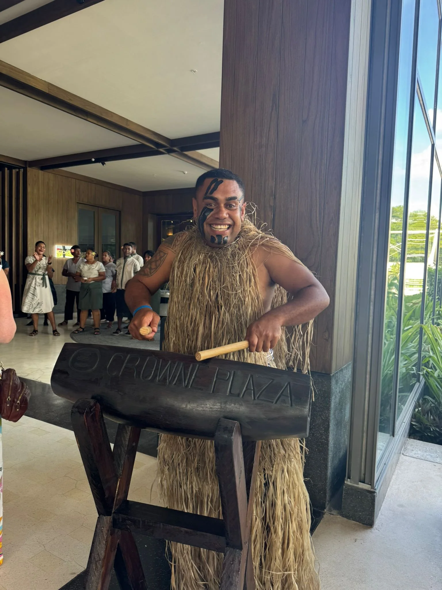 Cultural performer in grass skirt and face paint at a Pacific Island event hosted at Crowne Plaza.